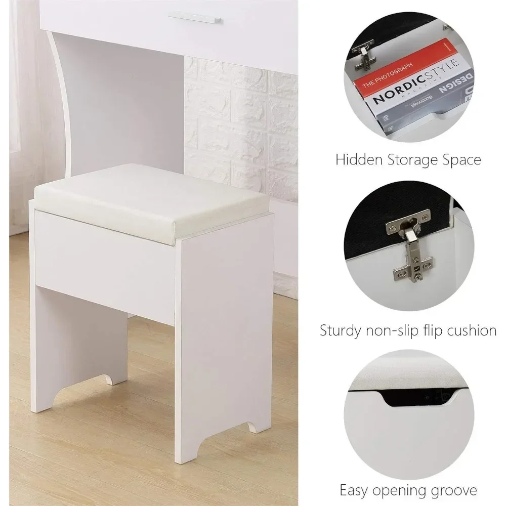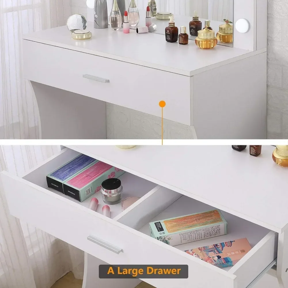 - [Large Storage Capacity] Your cosmetics, jewellery, and other beauty items will always be simple to find their place in a large drawer with 2 compartments of open storage space. Extra storage space is provided by the cushioned stool.