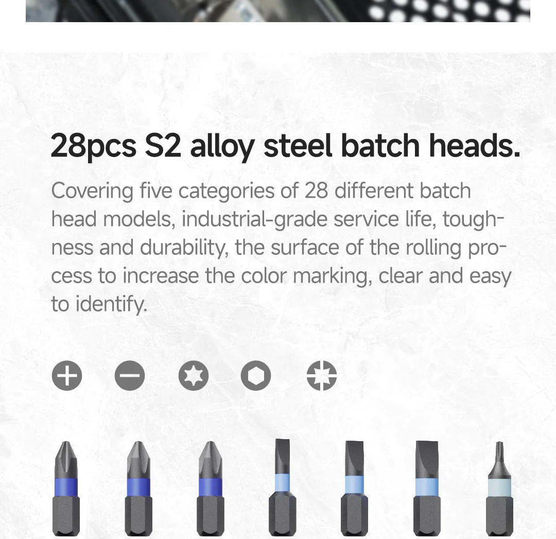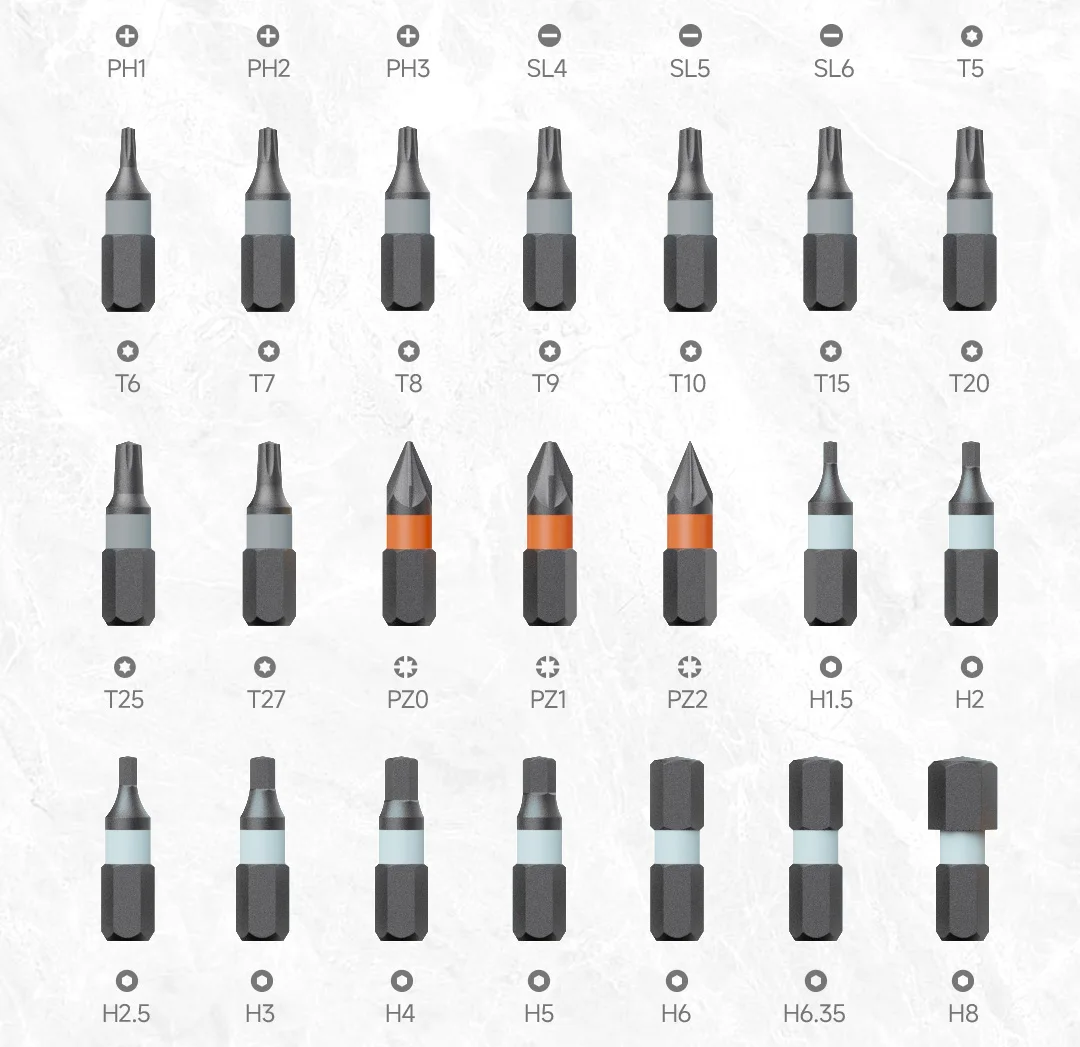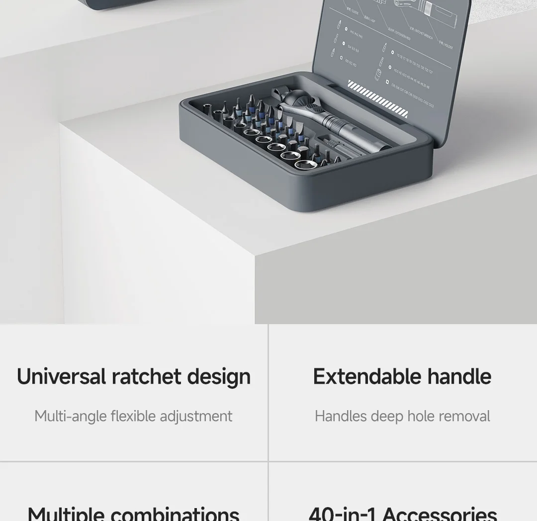 【Magnetic Precision】: Contains 40 magneticscrewdriver bits, ensuring a firm grip on screws for aseamless maintenance experience.【T-shaped Ratchet Handle】: Features a detachable T-shaped ratchet handle, offering enhanced leverage andcomfort during prolonged use.