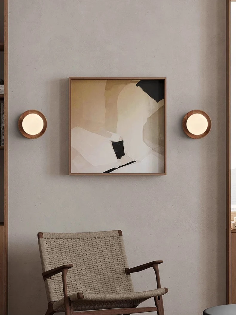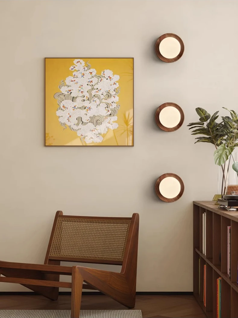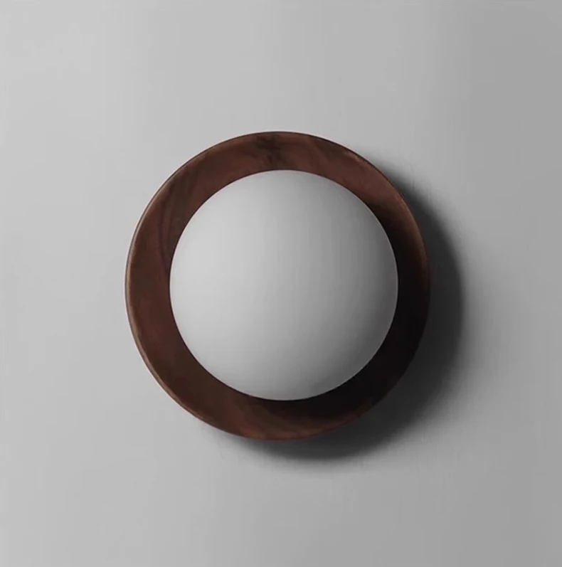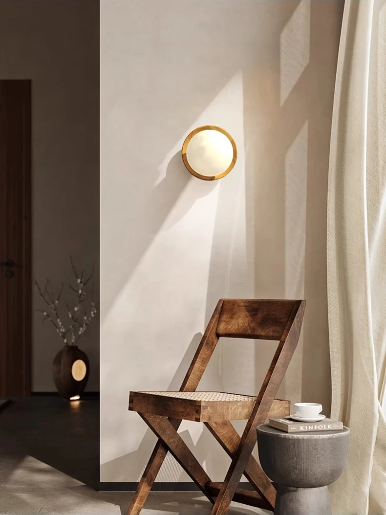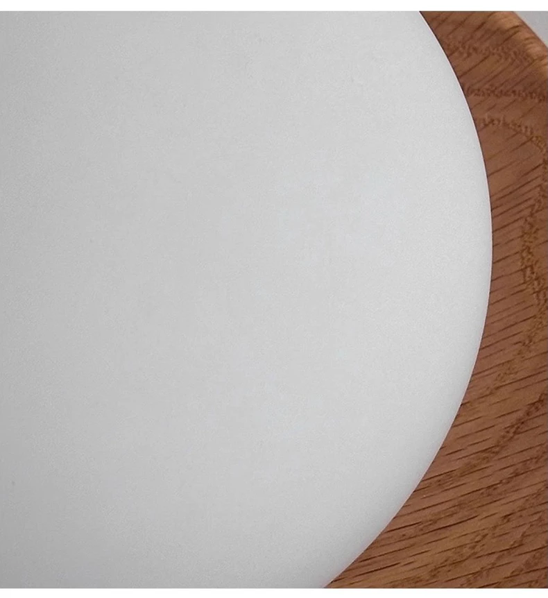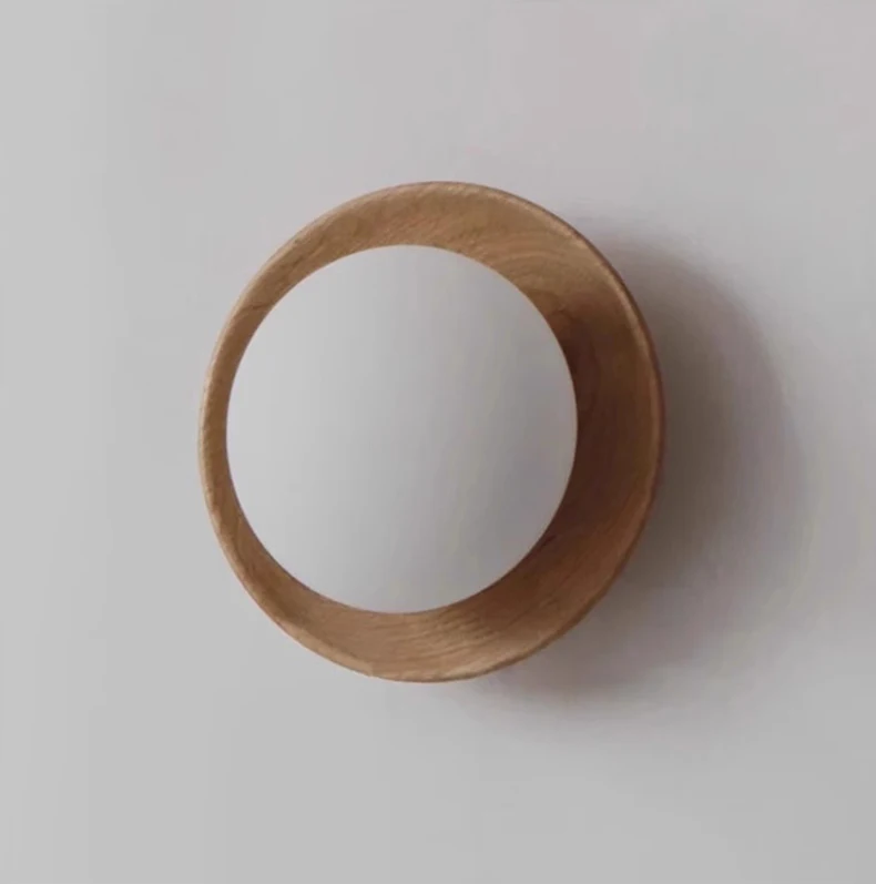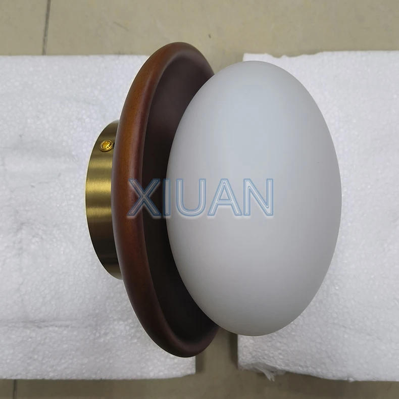 Wabi-sabi Style Nature Wood Walnut Color Bedroom Bedside Wall Lights Milky White Round Glass Wall Lamp for Hallway Stair Aisle