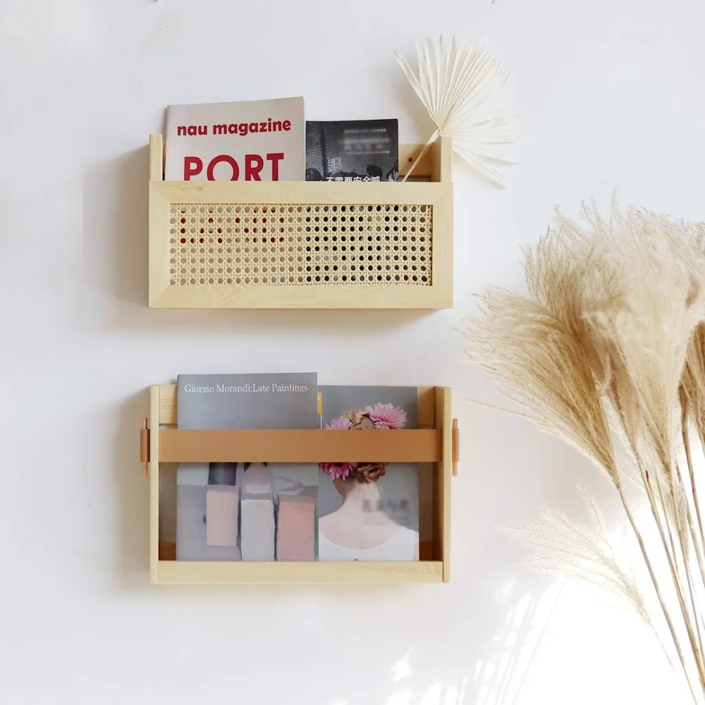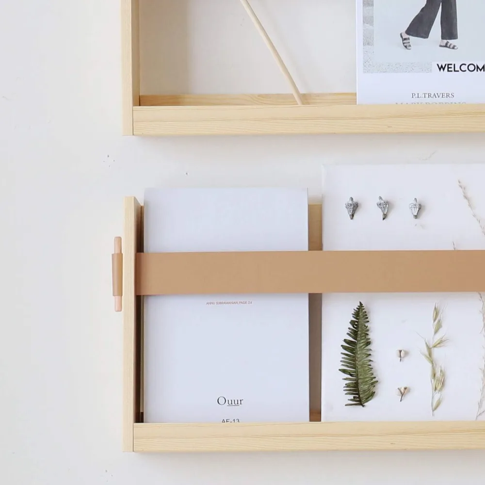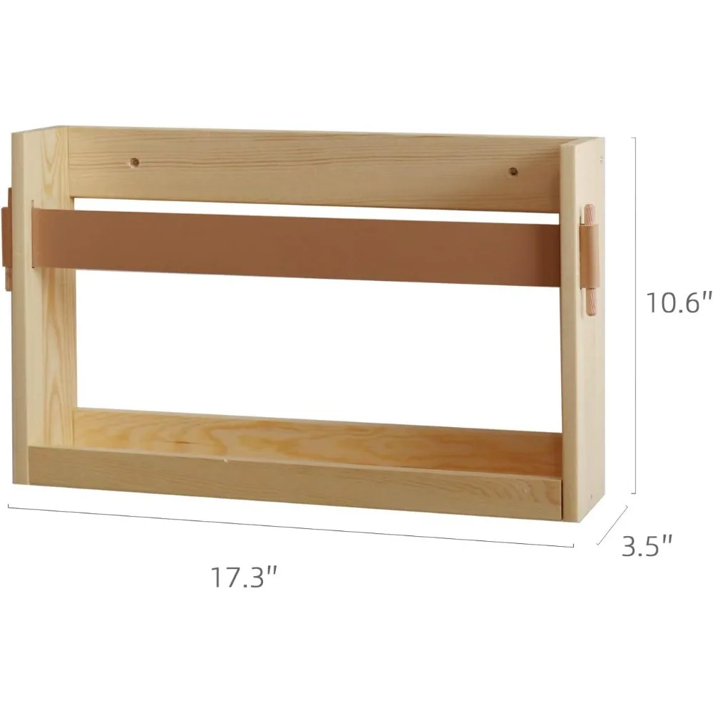 This item features a pine varnished board with a PU leather strap design, suitable for various home and office decors. Its stylish design with clean lines and a PU leather strap makes it a decorative addition to any space. The open wire design allows for easy visibility of the contents. This functional and versatile wall-mounted magazine rack can be used to display or store books, newspapers, e-readers, magazines near a chair or end table, or to organize mail, catalogs, and paperwork by the entryway. It's also perfect for showcasing children's artwork and works in various rooms, including living rooms, family rooms, bedrooms, offices, and dorms. Additionally, it can be used to store files, documents, literature, catalogs, mail, letters, charts, brochures, and notebooks, helping to keep your desktop clear in the office. The file holder comes with all necessary hardware and easy-to-follow instructions for simple assembly and installation. The dimensions are 17.3" x 3.5" x 10.6" high, with the inside basket measuring 16.3" wide x 2.8" deep.