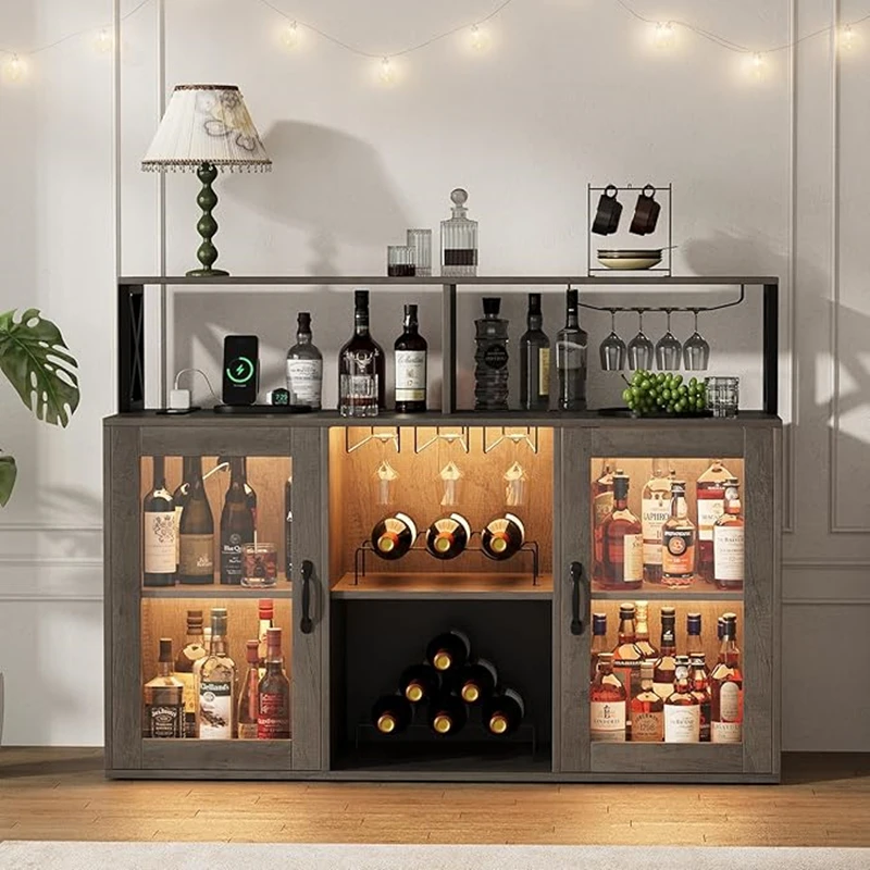 【Bar Cabinet with Charging Station】Our bar cabinet is equipped with 3 sockets and 2 USB ports, which can help you easily charge your coffee machine, juicer, bar accessories, glowing light decorations and even mobile phones and other electrical appliances. No need to look for an additional power strip, the one-piece design adds more convenience to your life. The cable length is 6.56 feet.