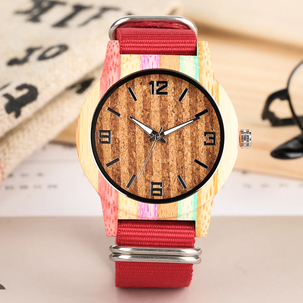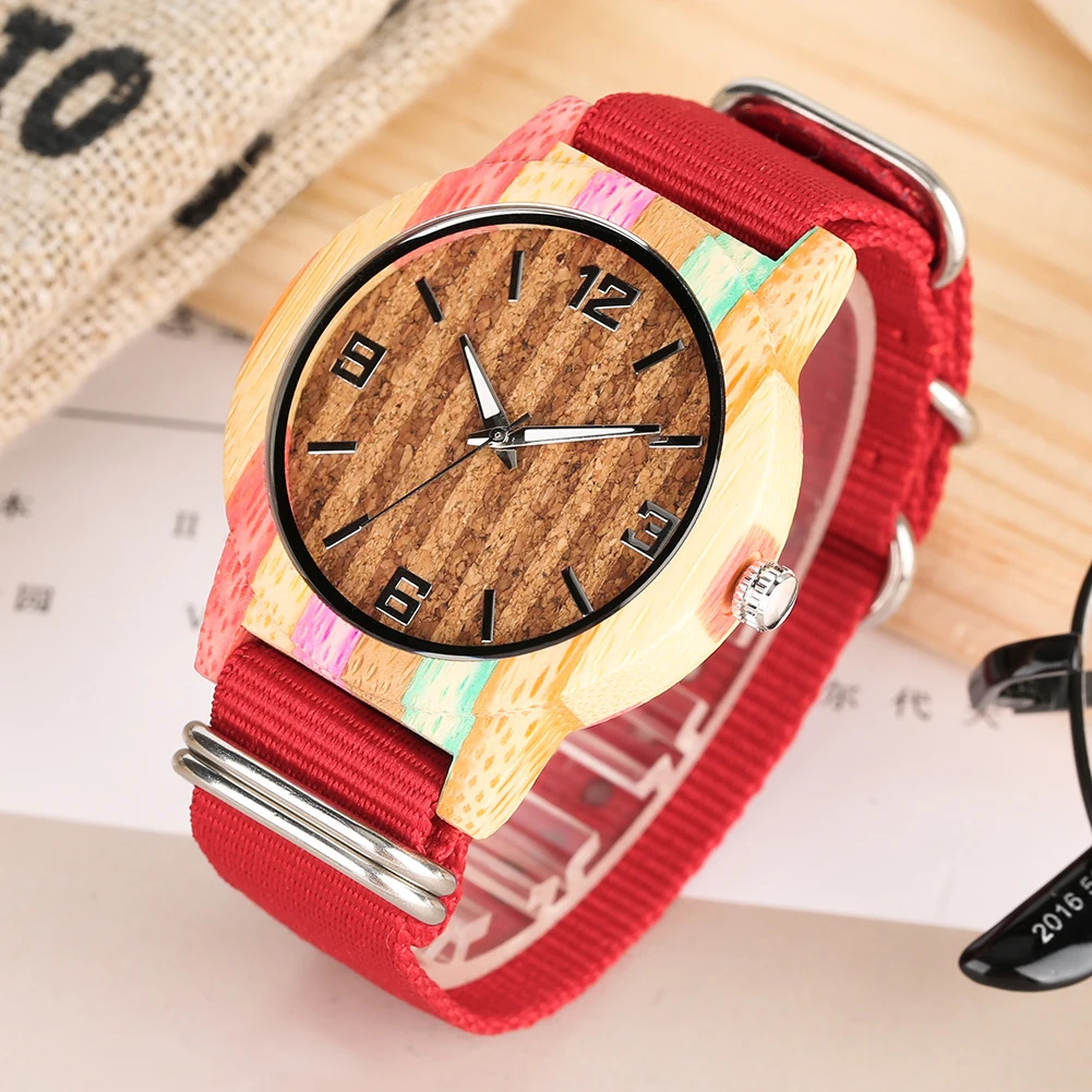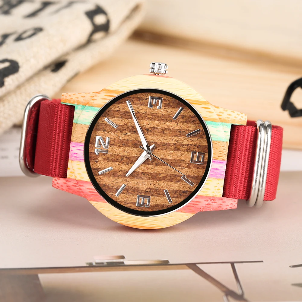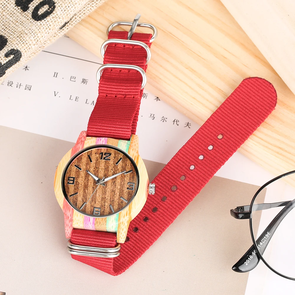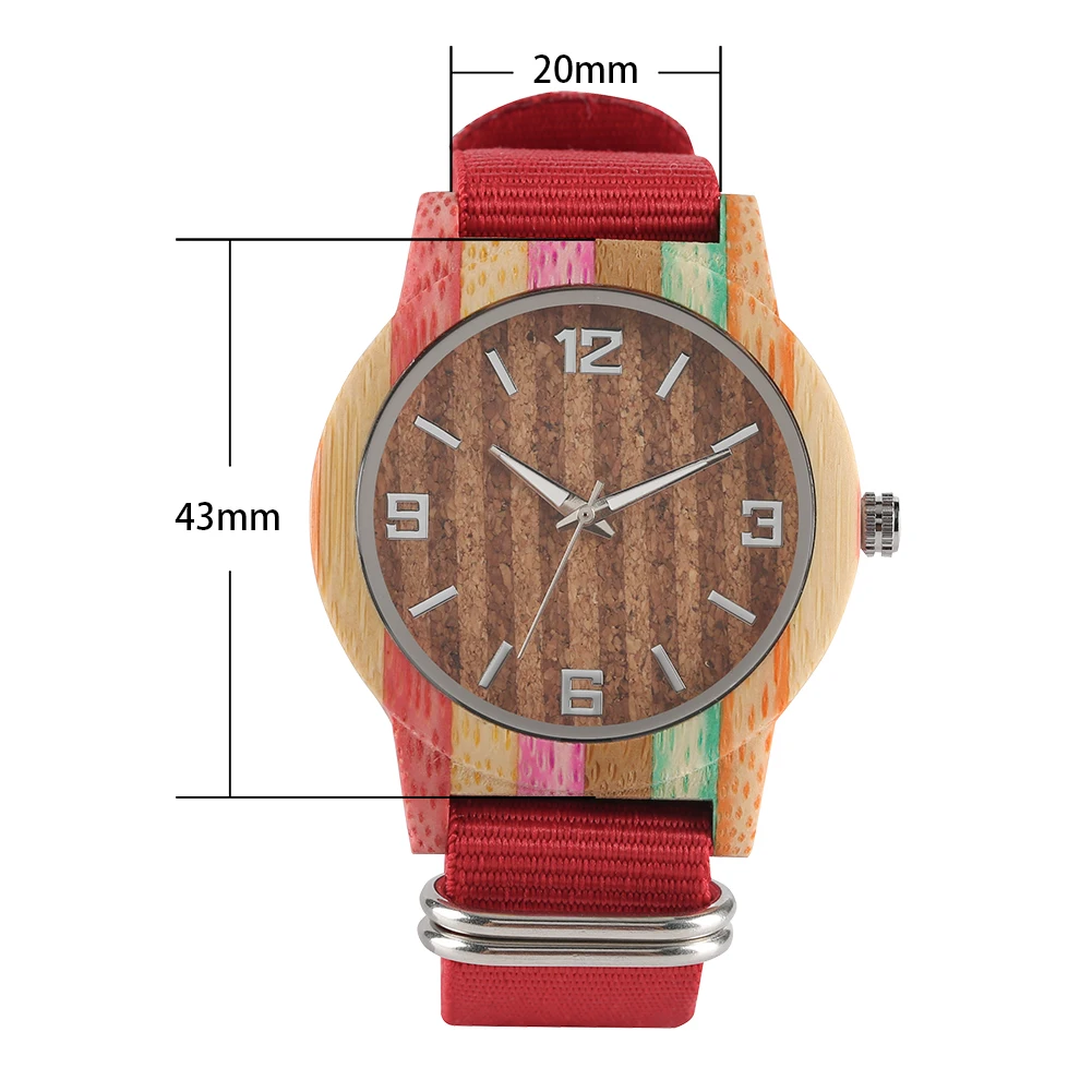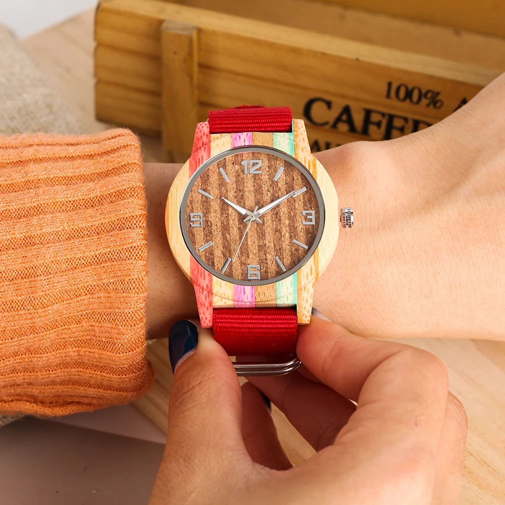 Colorful Appearance: Quartz bamboo wooden watch, colorful watch case, brown watch face, red watch watch band.
