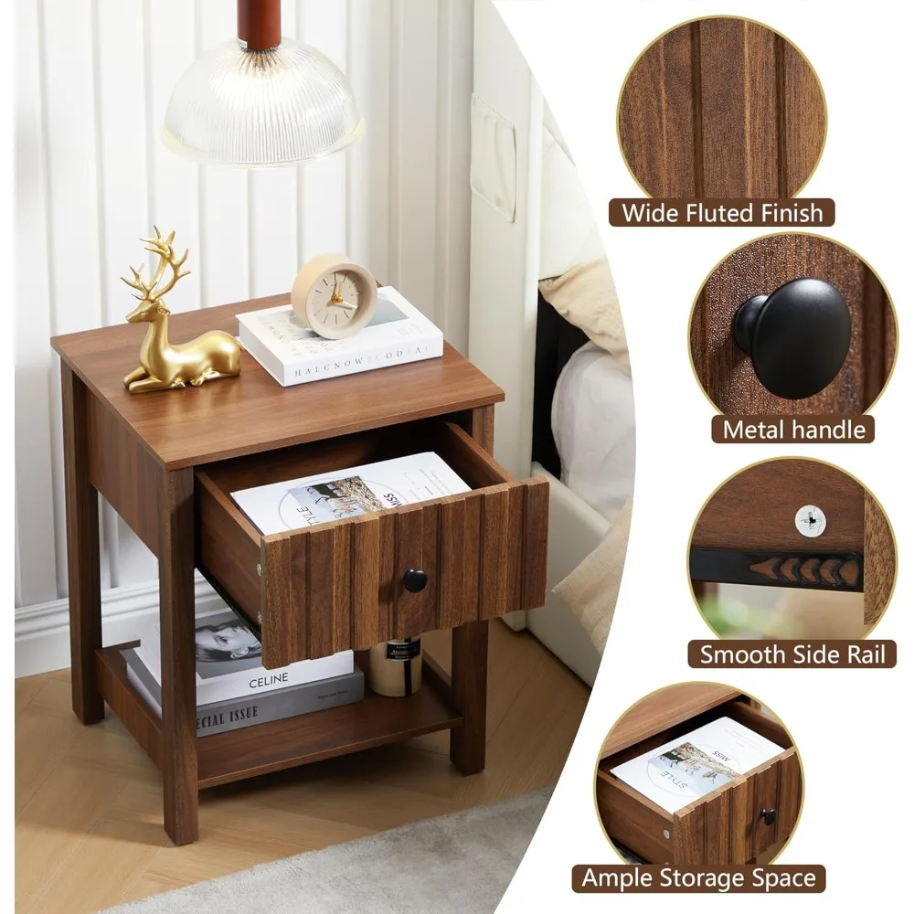 - 【 Product Advantage 】 Measuring 14.96"D × 17.71"W × 21.65"H. The bed side table adopts an wide fluted decorative design, adding a bohemian style. Equipped with spacious desktop and drawers, and an open bottom compartment. From books to electronic devices and personal belongings, everything can find its place in this spacious bedside table, ensuring that your space remains tidy, orderly, and within reach.