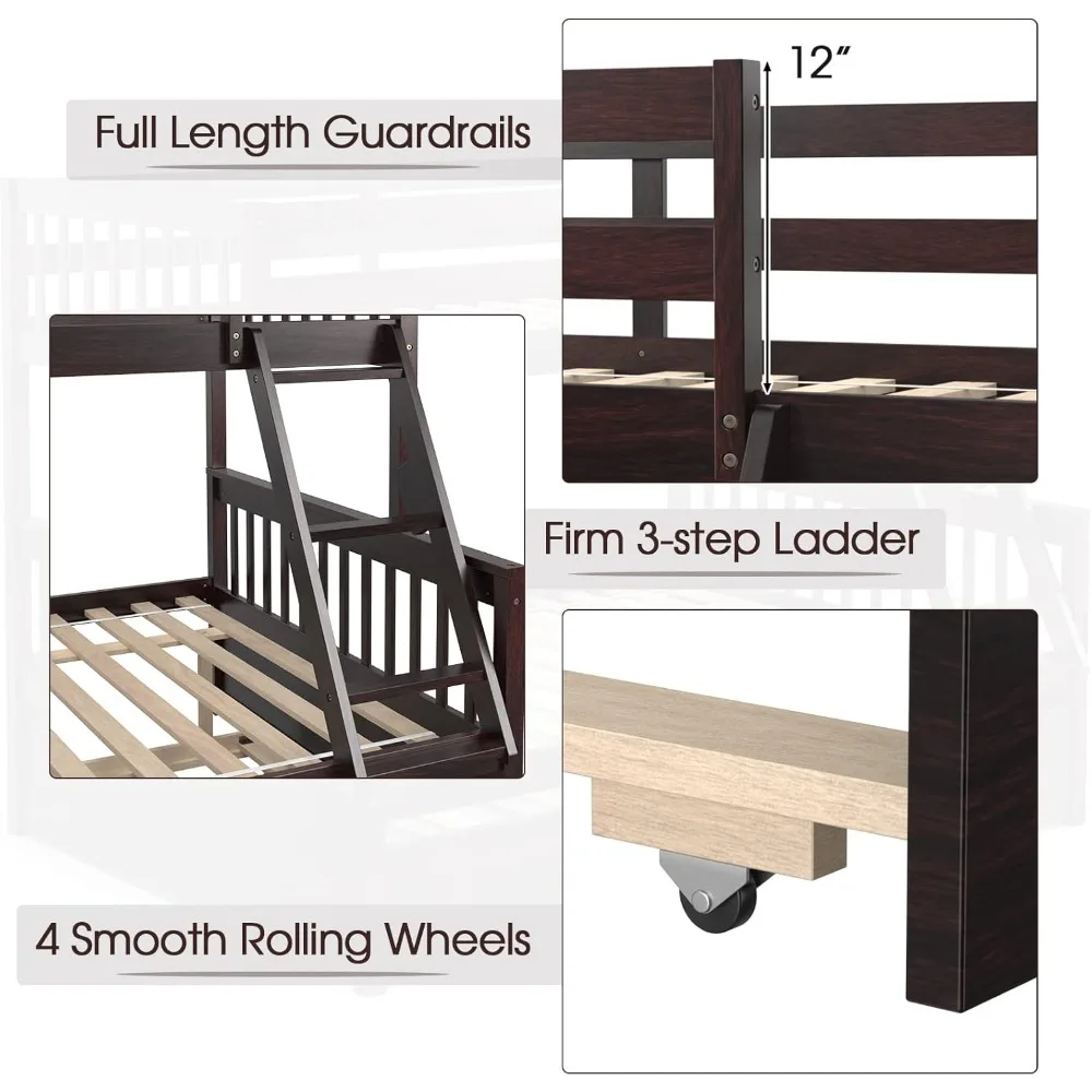 - Convertible Bunk Bed with Pull-out Trundle: The 3-in-1 convertible bed features a twin upper bed, a full lower bed and a twin trundle bed. This bunk bed can accommodate 4 people to enjoy together. The detachable bunk bed can be separated as 2 independent beds, so you can place them indifferent rooms. Plus, the trundle features 4 smooth rolling wheels for easy pulling.