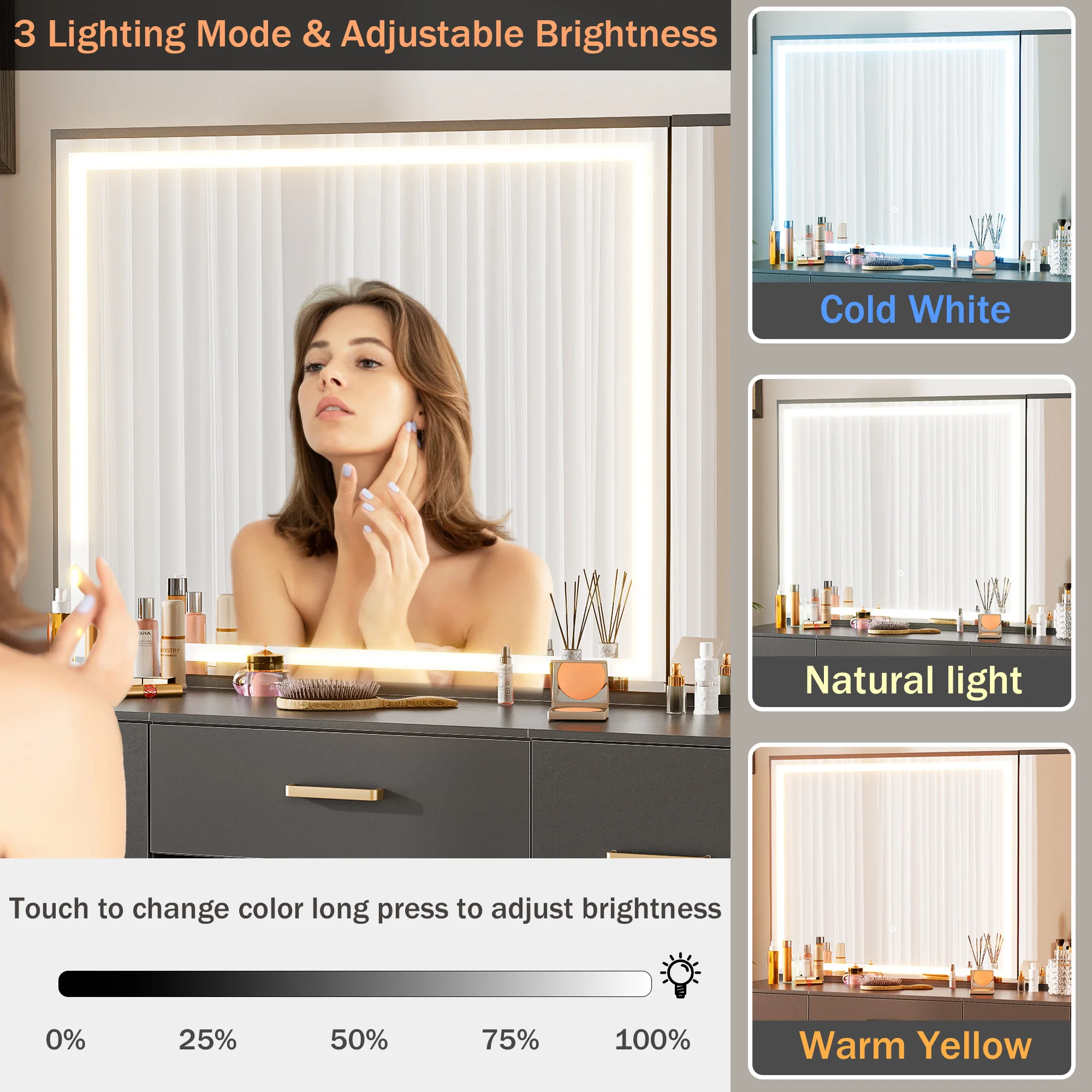 ✅【Extra-large Mirror】The vanity features an extra-large mirror, sized 40''L x 25.6''H. This expansive mirror offers a panoramic view, enabling you to see every detail of your appearance. The narrow bezel design maximizes the viewing area. Moreover, the advanced illumination strip, instead of bulbs, is infinitely dimmable, ensuring perfect lighting for any occasion.