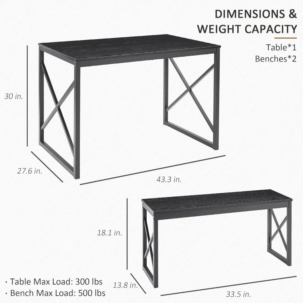 This dining table set is ideal for compact spaces, featuring a 43.3-inch rectangle table accompanied by two 33.5-inch benches. The benches can be conveniently stored under the table when not in use, maximizing space efficiency. Crafted from reinforced MDF board and steel tubes, the kitchen table and benches promise durability and sturdiness. The tabletop, along with its black painted frame, boasts water and scratch resistance, making it easy to maintain and suitable for everyday use. Assembly is straightforward due to the table set's simple design, with all necessary parts and tools provided and clearly marked. This table set comfortably seats four, making it perfect for family meals. Its wooden grain top and sleek black frame offer a versatile look that fits well in any kitchen, living room, or small area. Should you face any issues with your purchase, our customer service is ready to assist with free parts or a full item replacement.