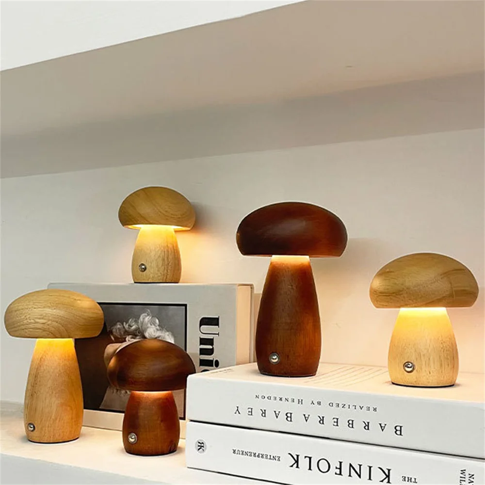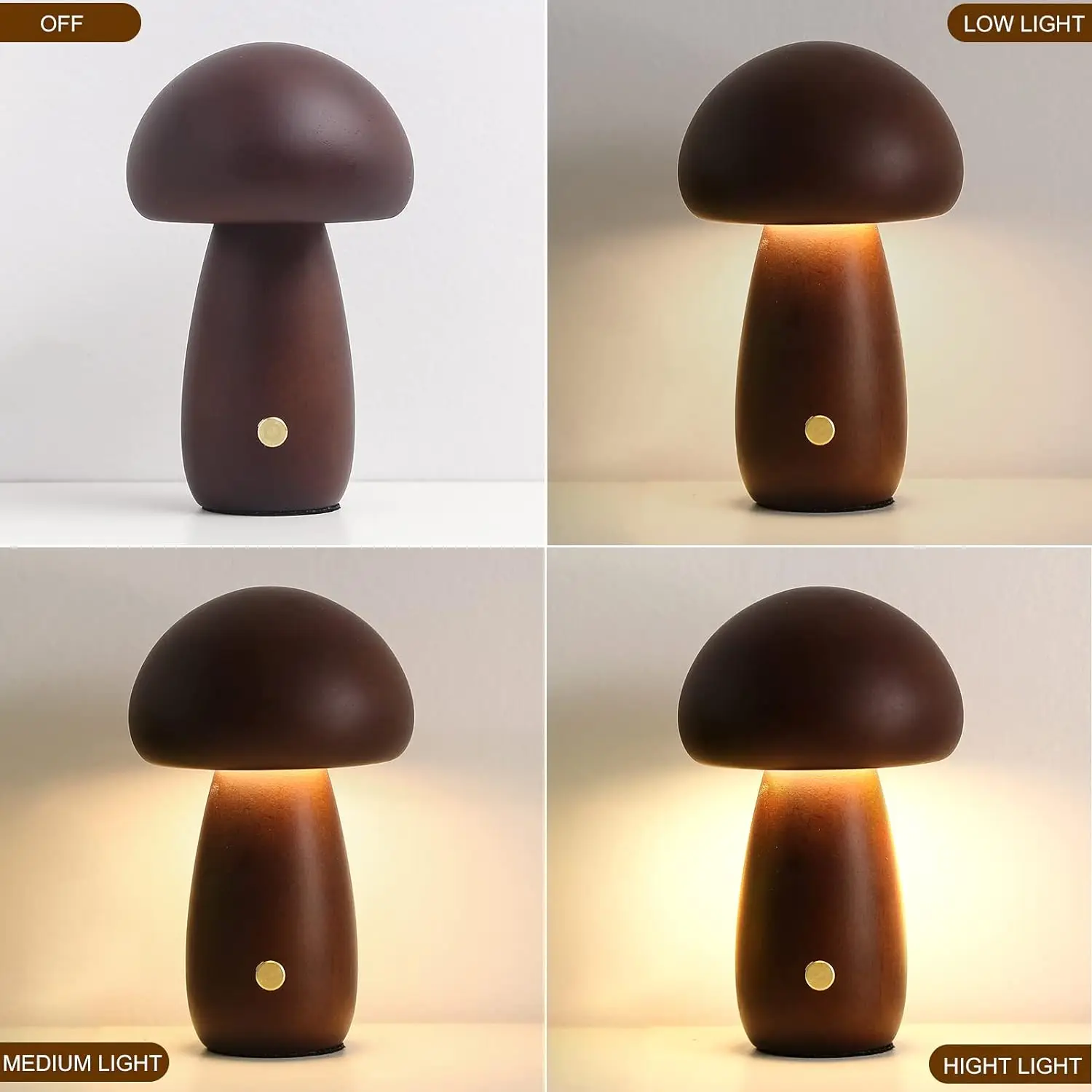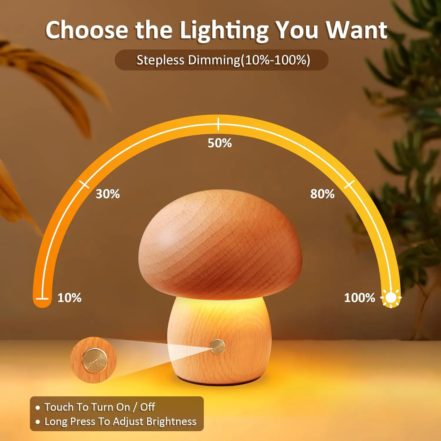 Wooden Mushroom Lamp, Portable Cordless Rechargeable Battery Operated Lamp,Stepless Dimming, Night Light for Birthday Gifts