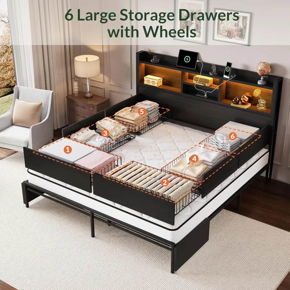 - 【Storage Space Everywhere】Queen Size Bed Frame with 6 large capacity sliding drawers that offer ample place to collect sheets, accessories, and off-season clothing. This is Storage Bed Frame Also equipped with screw clips, you can secure the drawer to the bottom of the bed to prevent it from sliding out.